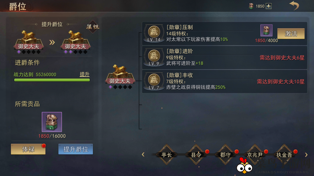 Ø 达到战力要求,以名望或晋爵令升级爵位