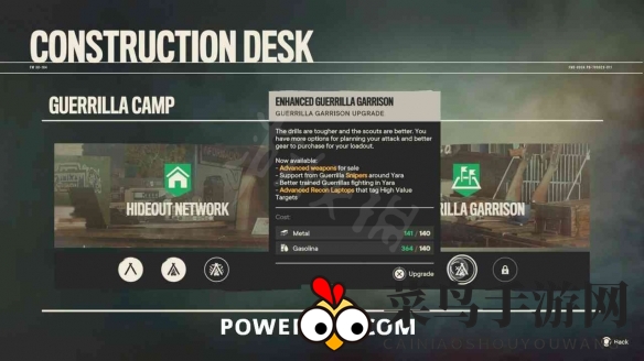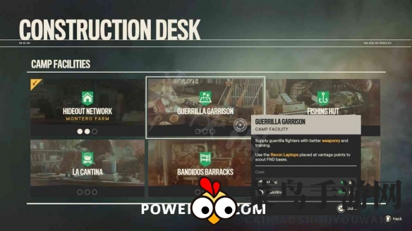 1. 在游戏中,你可在任意营地建立“游击队驻军”设施,所需材料是60合金和60汽油。