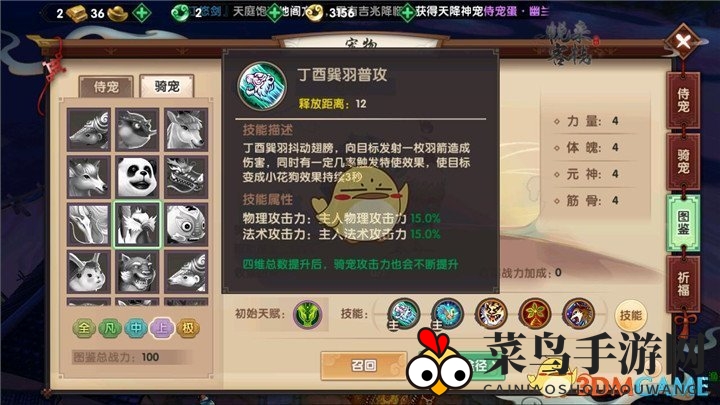 我,这位紫色品质的骑宠,初始基础四维高达4点,可突破至10点,支持双人共骑,移动速度飙升135%。别小看我是一只鸡,我可是能翱翔天际的!还记得《成龙历险记》中的那只鸡吗?我的翱翔,必将更胜一筹!但为了进化成飞行形态,需要你们为我搜集美味的天元仙露。