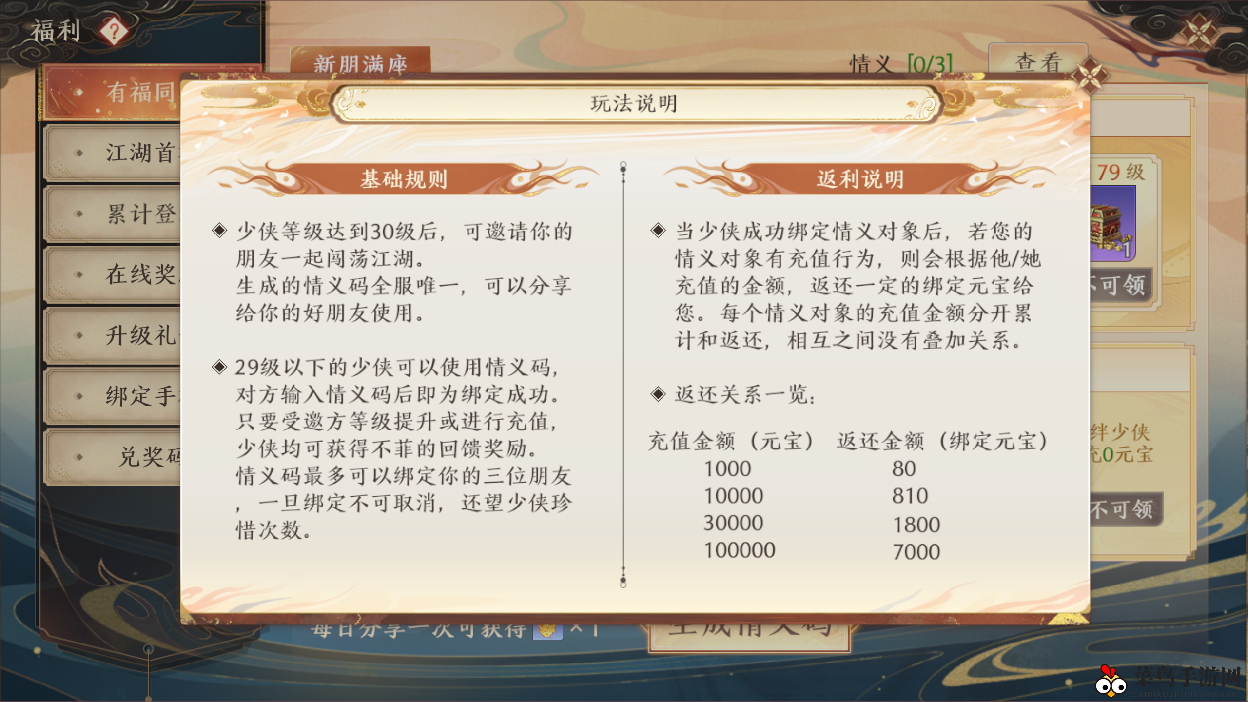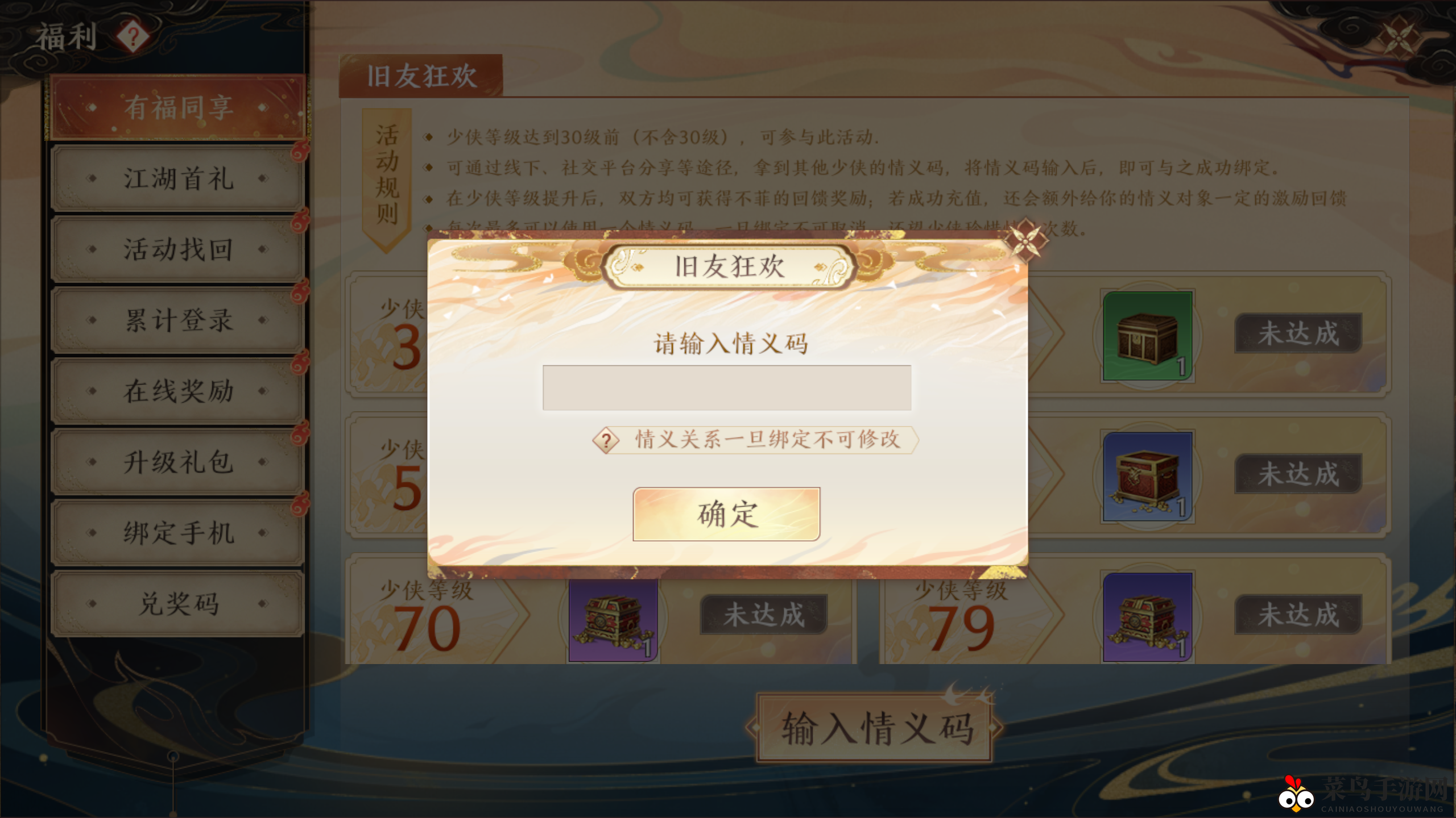 29级以下的侠士们,情义码是你们的特权礼物。好友输入情义码,绑定一触即成,操作简单。