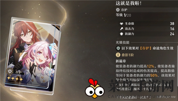 存护光锥提升防御力,并增加根据自身防御力提供护盾的角色护盾量,第二个被动能提升终结技伤害,但效果有限。