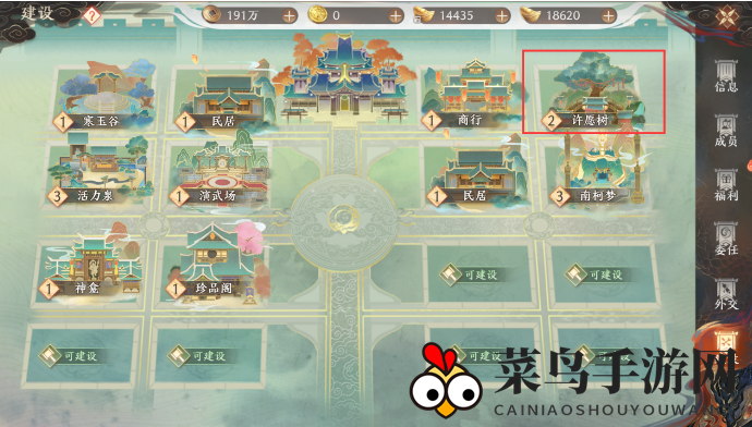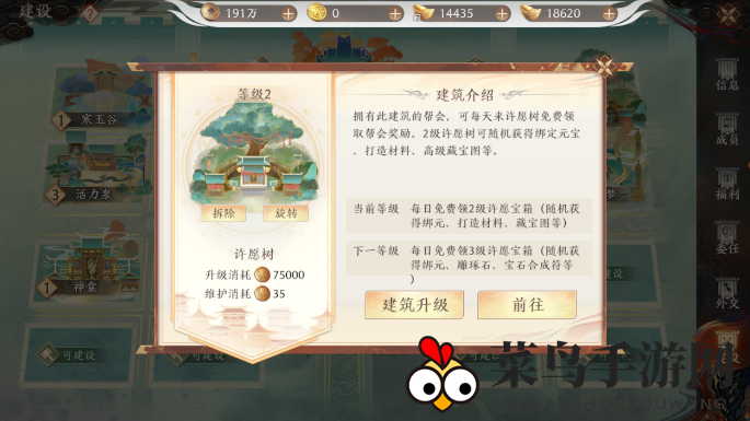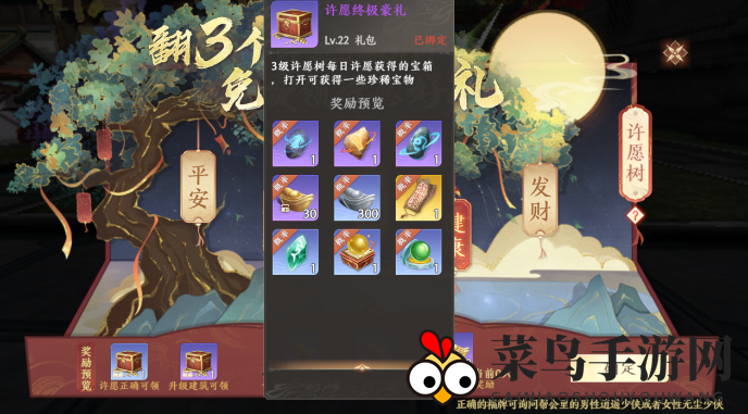 点击【许愿树】了解详细玩法,建筑等级越高,奖励越丰富。