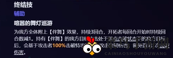 为我方全体提供【伴舞】效果,持续3回合,每回合减少1点【伴舞】效果持续时间。持有【伴舞】效果的我方目标攻击处于弱点击破状态的敌方目标时,基于攻击者100%击破特攻和本次攻击削韧伤害,额外造成1次击破伤害。