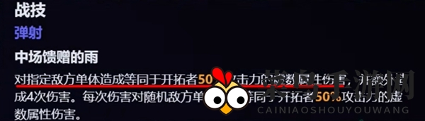 对指定敌方单体造成等同于开拓者50%攻击力的虚数伤害,并额外发动4次攻击。每次攻击对随机敌方单体造成等同于开拓者50%攻击力的虚数伤害。