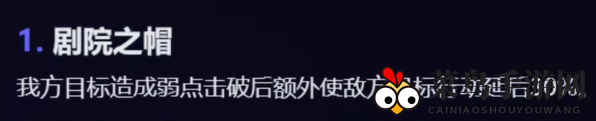 1、舞会之帽:我方目标在造成弱点击破后,使敌方目标行动延迟30%。
