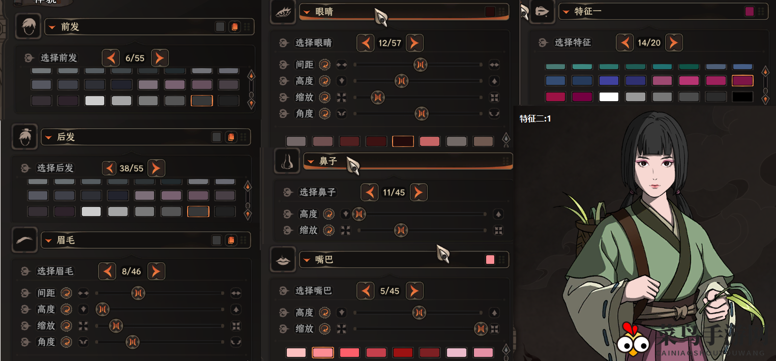 前发19 后发6 眉毛2 眼睛3 鼻子2 嘴巴5 特征一9 特征二1 服装12