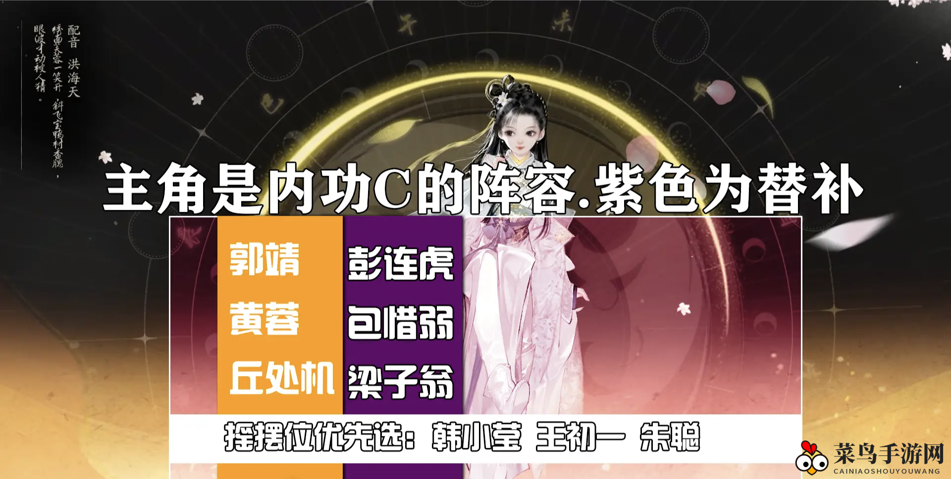黄蓉作为开服三境赠送的角色,前期可以使用全金发,包惜弱作为过渡角色。丘处机单挑能力强,新手池中抽到丘处机后,签到14天可选择杨康;若抽到杨康,则选择丘处机。