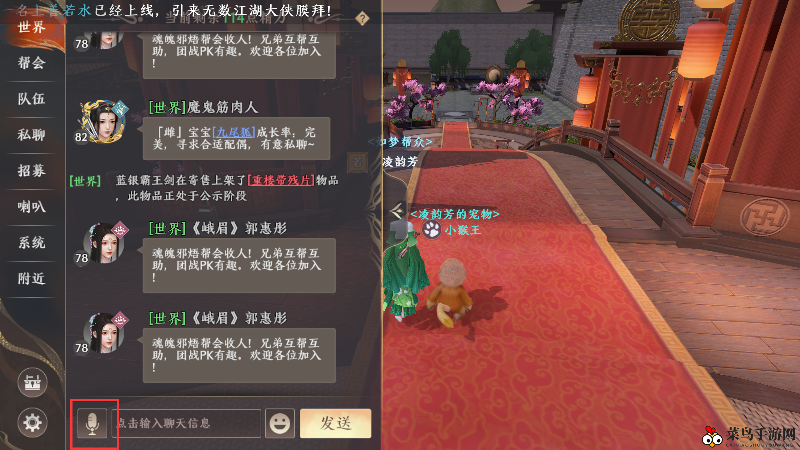 主界面中,侠士们可通过快速切换频道,长按发送语音,沟通更加方便快捷。