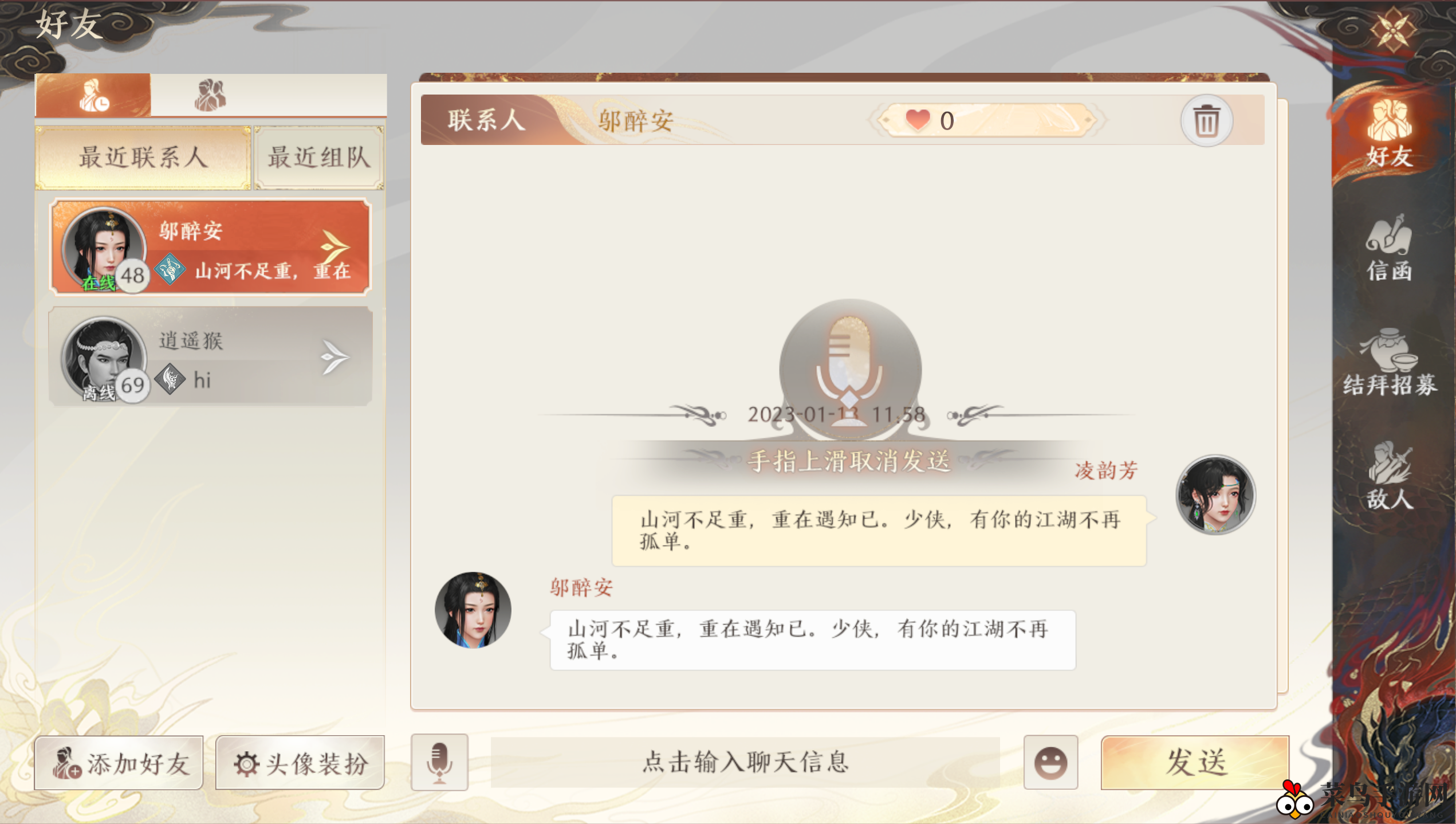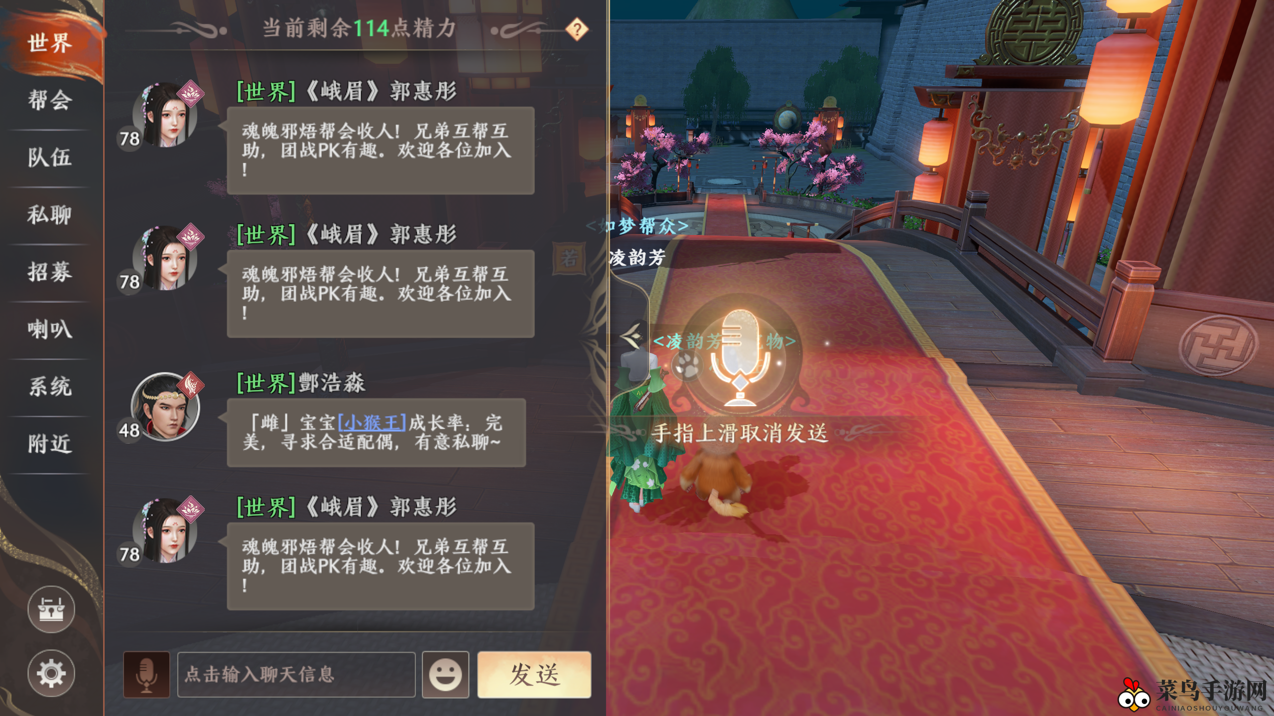 探秘《天龙八部2》中的语音沟通新境界,本篇将带您领略其在游戏对话中的卓越表现。侠士们在聊天界面中,可以无障碍地发送语音,享受无缝沟通的乐趣。只需轻触【话筒】键,即刻开启语音录制之旅;若想撤销,只需简单上滑手指即可。对于那些对语音系统还不太熟悉的玩家,今天的详细介绍将是您的得力助手!