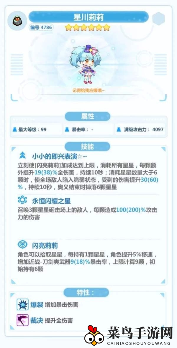 角色可收集星星,每拥有1颗星星,角色提升5%移速,近战-刀剑类武器暴击率增加9(18)%,上限为9颗,初始持有6颗。