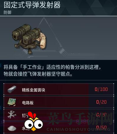 2、制作固定式导弹发射器所需材料:精炼金属铸块100、电路板20、钉子20、水泥50