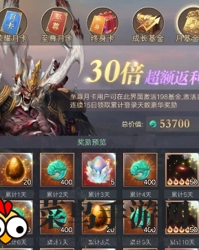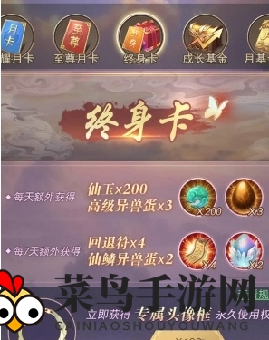 3、月基金:商城里的性价比之选,购买后即可获得丰富的五星异兽、仙鳞蛋、高级异兽蛋、4次十连抽以及4400仙玉等奖励。