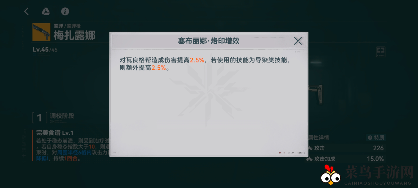 塞布丽娜·烙印增强:对瓦良格帮造成伤害提高 2.5%。若使用导染类技能,则额外提高 2.5%。