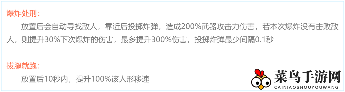 此技能释放后,自动锁定敌人,投掷炸弹造成200%武器攻击力伤害。若首次爆炸未能击败敌人,则后续爆炸伤害增加30%,最高可达300%,投掷炸弹的间隔至少为0.1秒。
