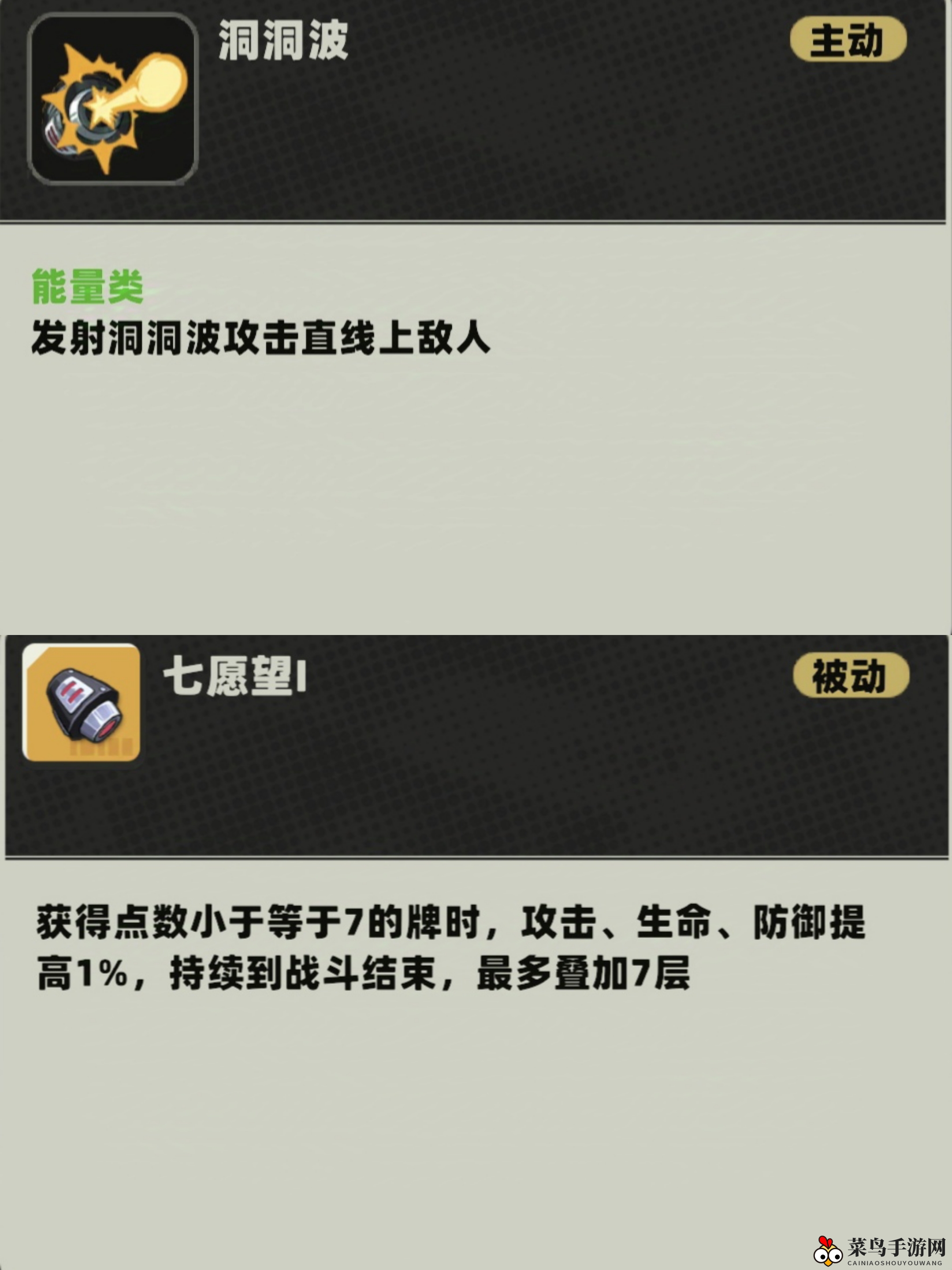 七愿望配件。玩家每获得一张点数小于七的战牌,桃的攻击、防御、生命数值便提升1%,直至强化至七层巅峰。